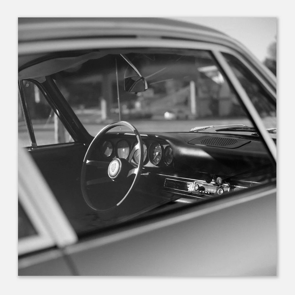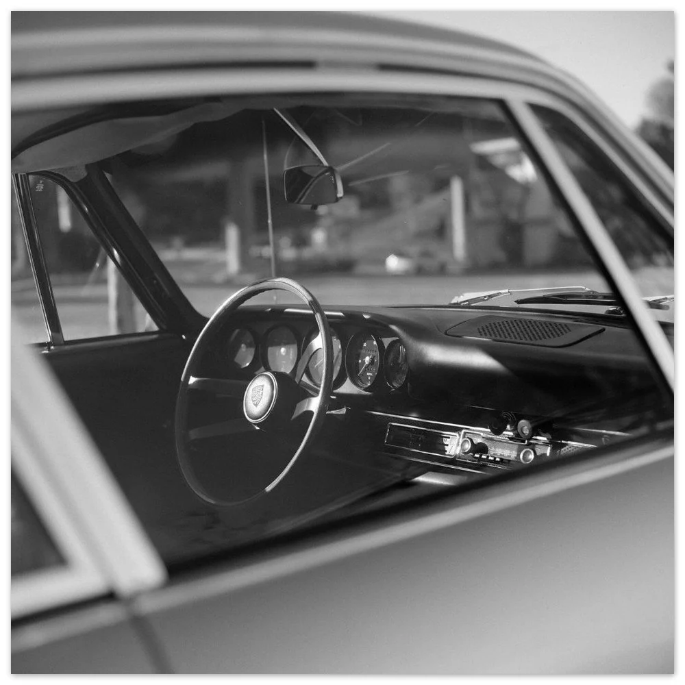 A detail shot of a vintage Porsche’s control cluster through the passenger-side window. Available as a fine art poster for thoughtful display.