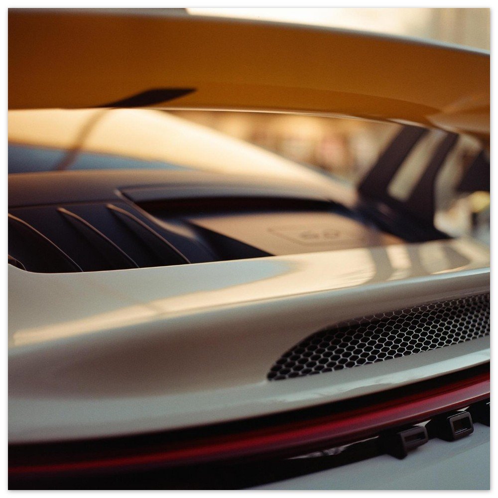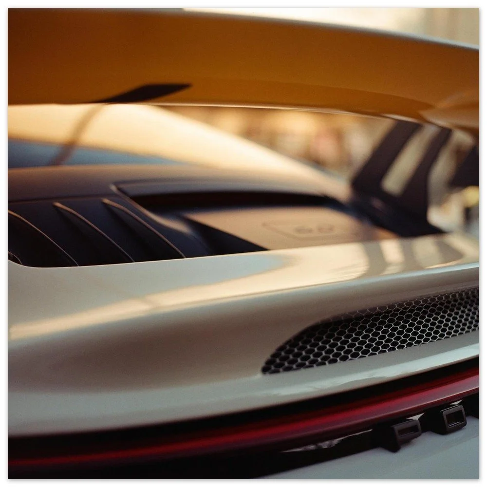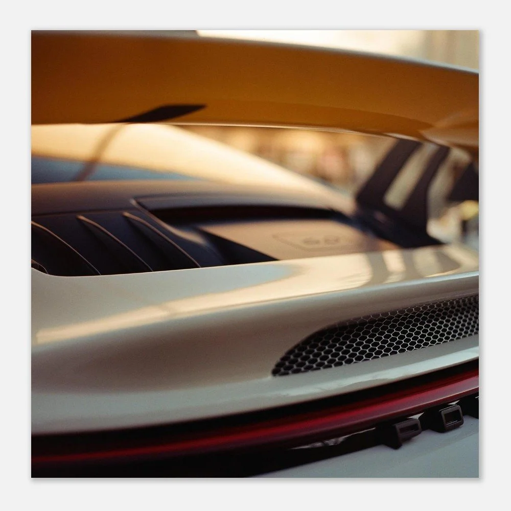 The cutting edge of modern: a rear wing designed to dominate, keeping this machine pinned to the asphalt. Available as a fine art poster for thoughtful display.