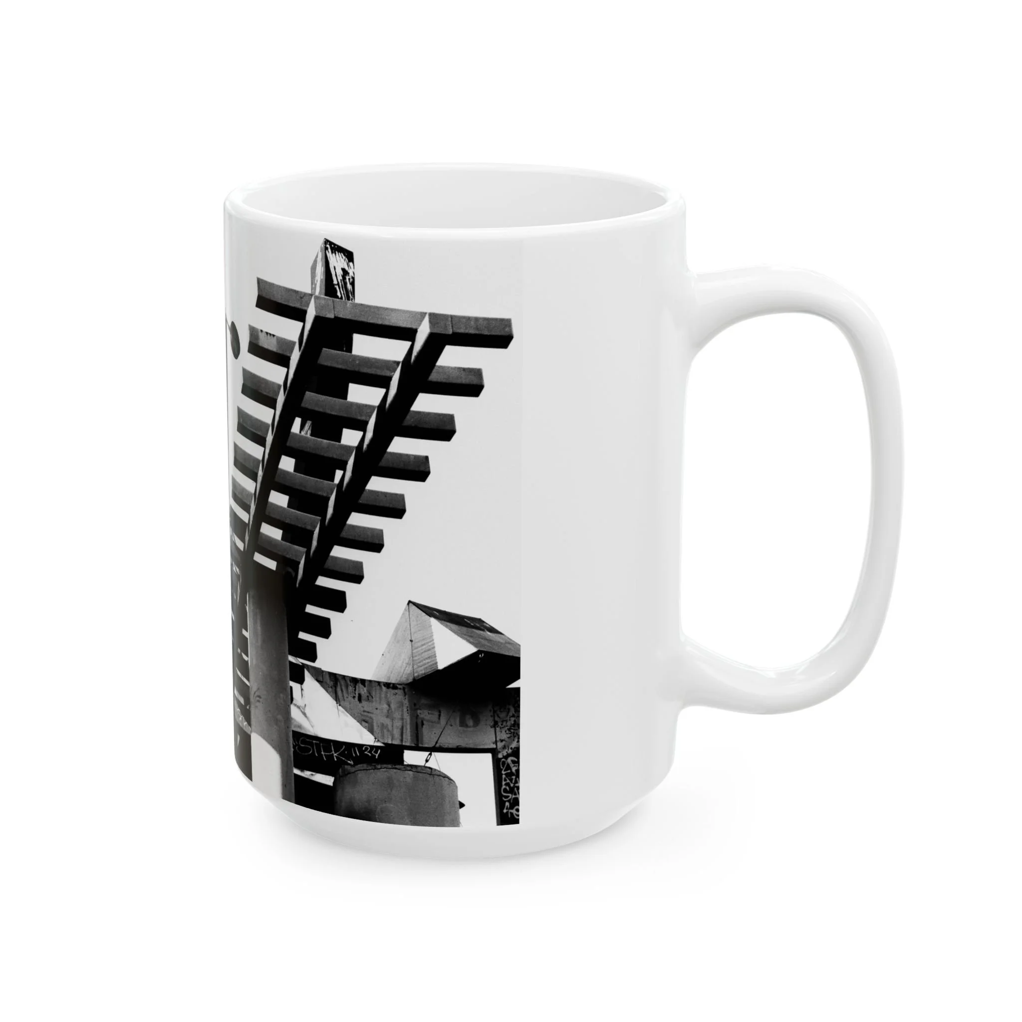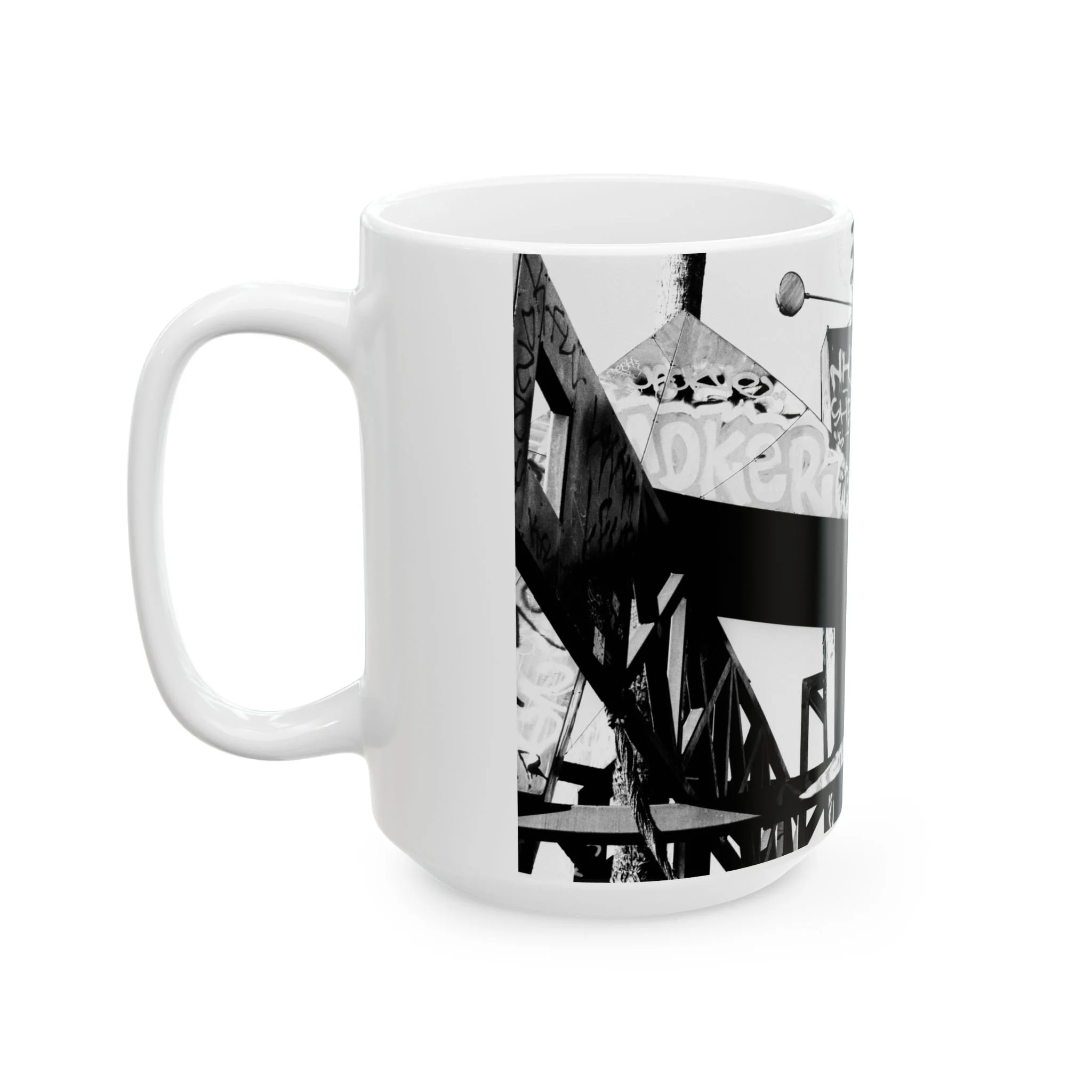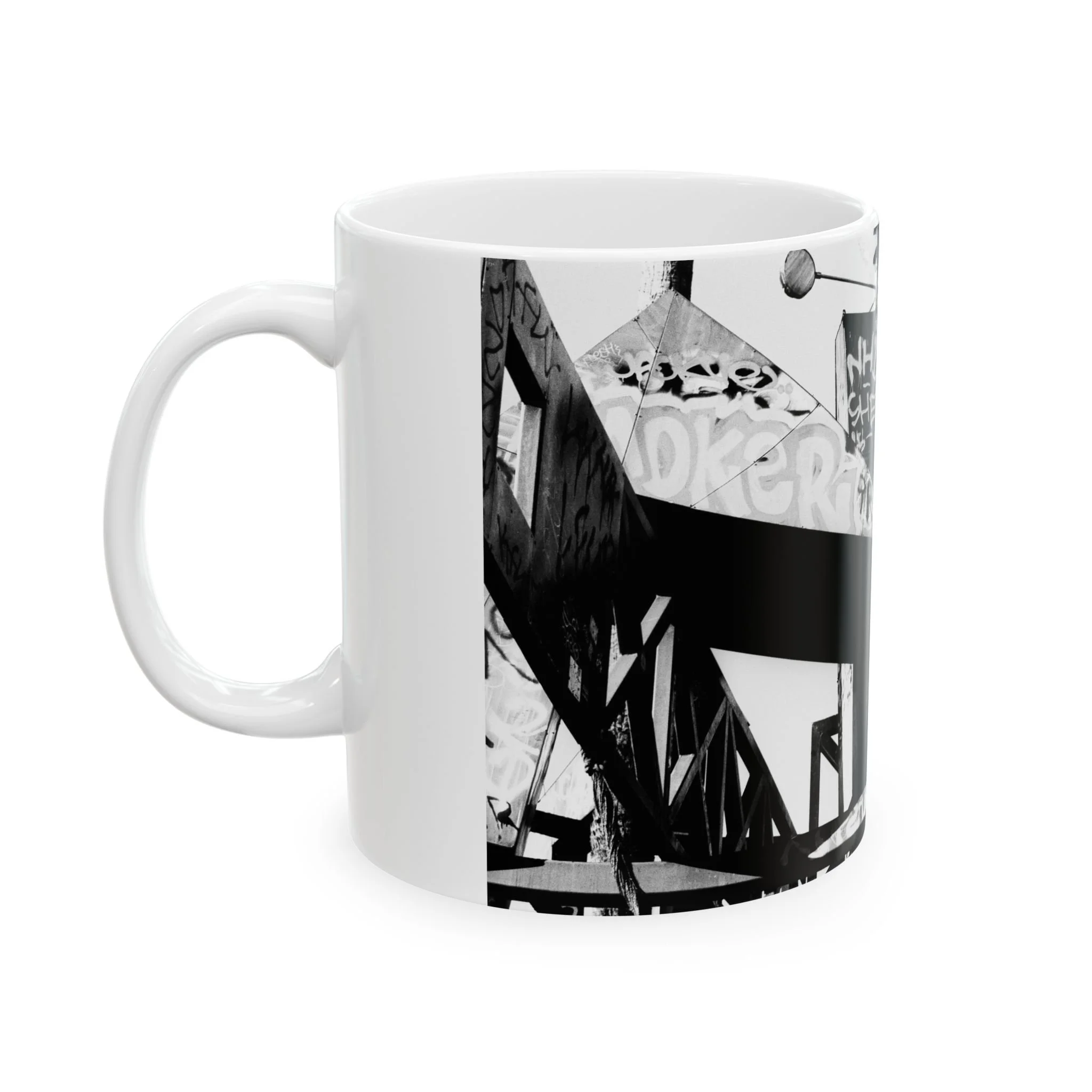 A detailed look at Angel’s Point’s industrial masterpiece, layered with the tags of the season’s graffiti artists. Printed as a wraparound design on a ceramic mug for everyday art in your hands.