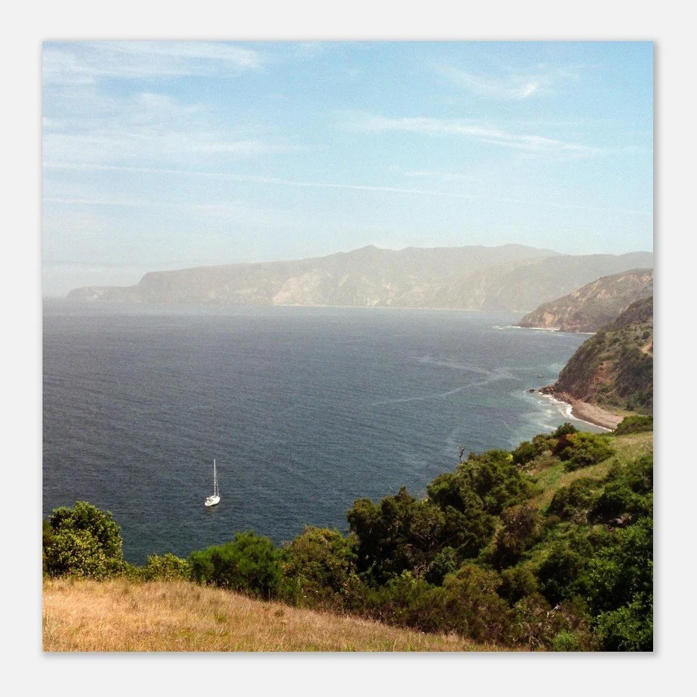 Taken from high above the Pacific, in the Channel Islands, one of California's least visited national parks. The hills roll around the hidden cove, and the Pacific glitters to infinity.