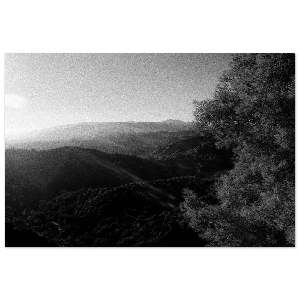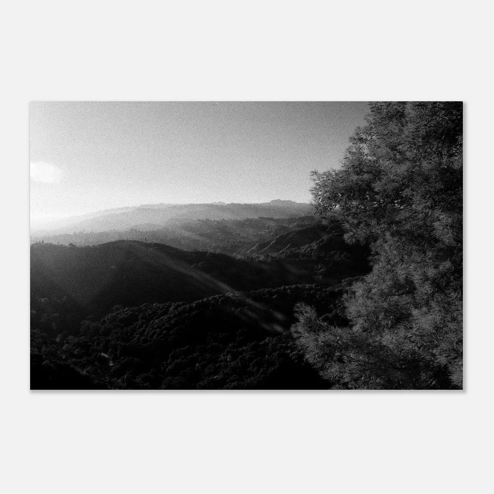 Rolling California hills tumble into the distance while sharp pine needle details ground the foreground. Available as a fine art poster for thoughtful display.